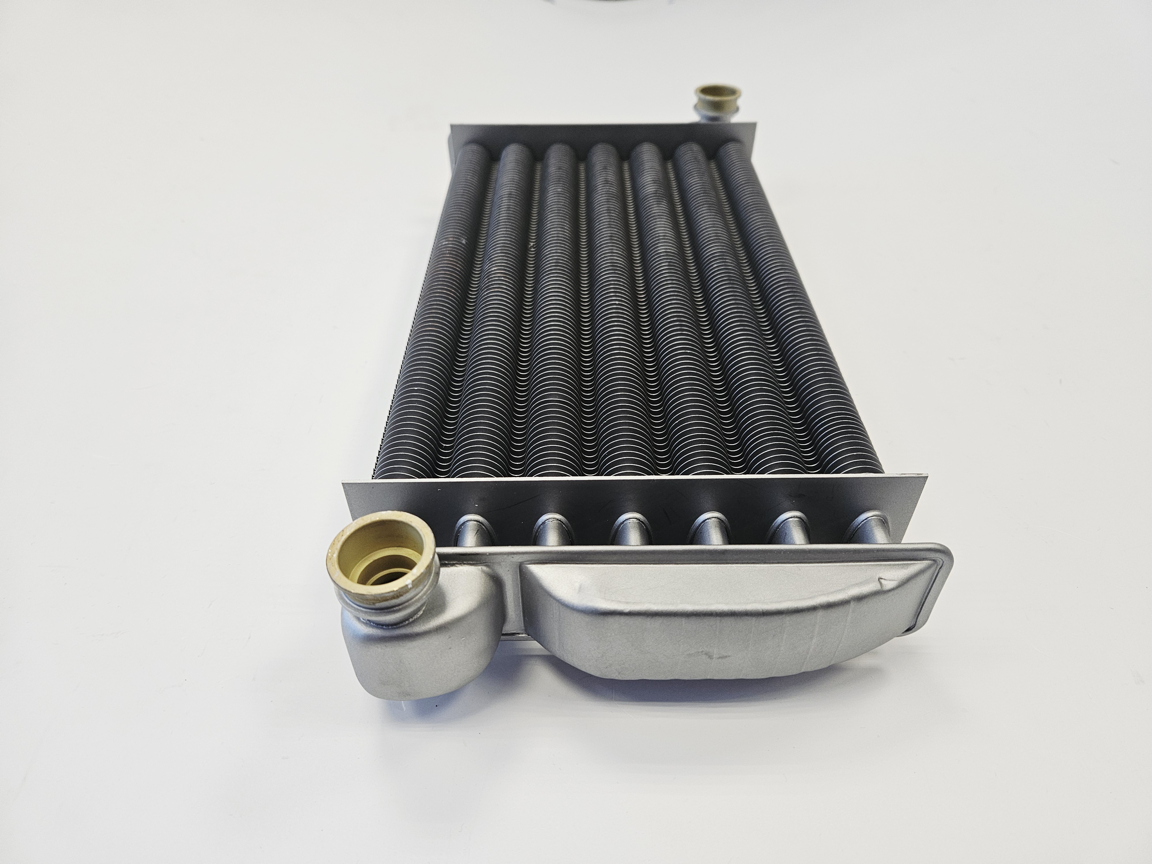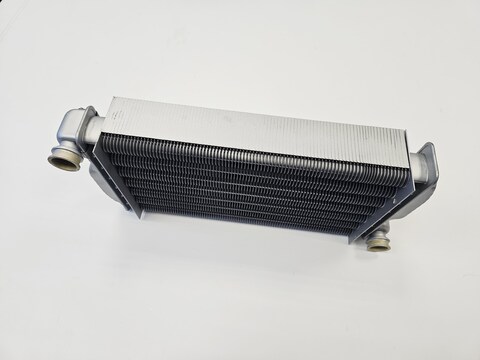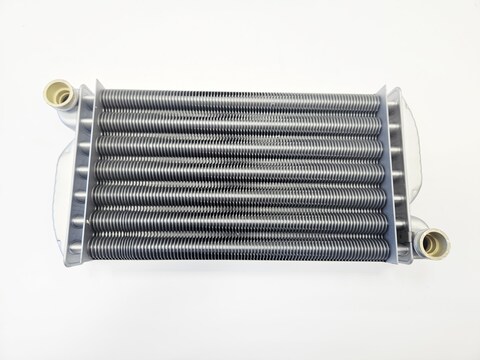 Теплообменник – устройство, обеспечивающее теплообмен между двумя теплоносителями с различными температурами. Материалом теплообменников в газовых котлах могут служить медь, сталь, чугун, алюминий. В настенных котлах чаще всего в качестве основного применяются медные теплообменники, для максимально эффективной передачи тепла от дымовых газов теплоносителю в системе отопления, а по конструкции представляют собой трубы с напаянными на них пластинами (ламелями) для увеличения площади теплообмена. Вторичный теплообменник ГВС в настенных двухконтурных котлах выполнен из нержавеющей стали и является пластинчатым.